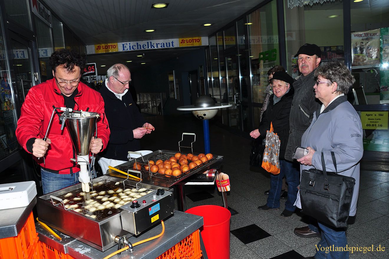 Die beliebten Quarkini-Bällchen gibt es zum Eröffnungstag des Geschäftes in der Kino-Passage. Bäckermeister Reinhard Schulze (l.) und Frank Leipert (2.v.l.) haben alle Hände voll zu tun.