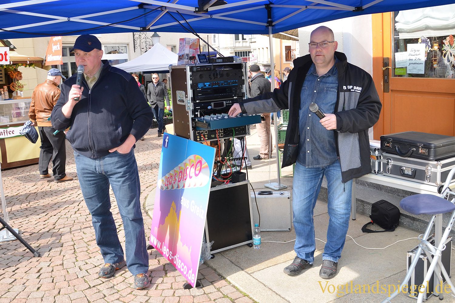 GFD-Chef Frank Böttger (l.) begrüßt die Gäste auf dem Greizer Markt.
