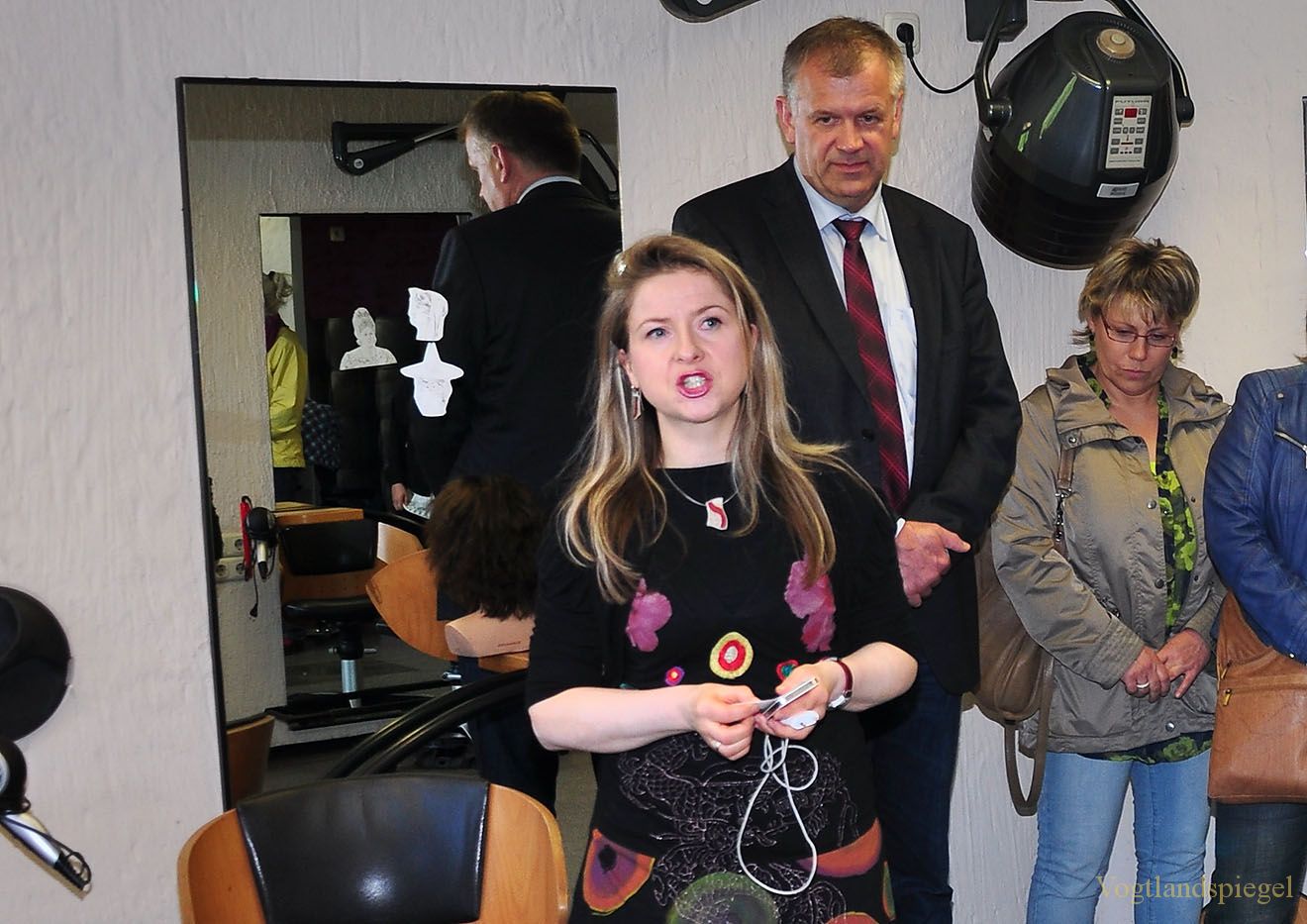 Pädagogin Cornelia Schütte gibt einige Erläuterungen zur Perücken- Schau im Friseurgeschäft „Haarscharf“ in der Greizer Mollbergstraße.