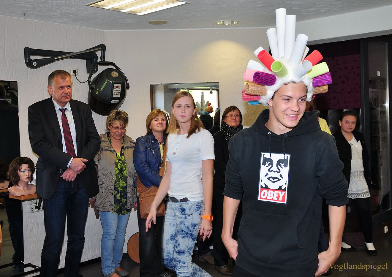 Die Neuntklässler des Kurses Darstellen und Gestalten am Ulf-Merbold-Gymnasium präsentieren im Friseurgeschäft „Haarscharf“ eine Perücken-Schau – hier ein kreatives Modell a la Stiftaufbewahrungsrollen.