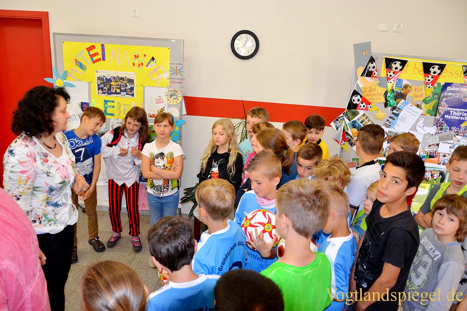 Die Schulleiterin der Lessing-Grundschule Greiz, Marlies Langebach, hat für die Schüler eine Überraschung parat.