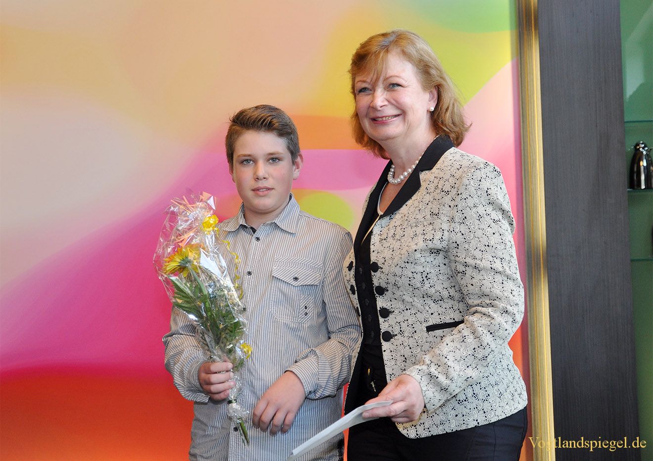Tom Rybka wird von Landrätin Martina Schweinsburg für seine hervorragenden Leistungen geehrt.