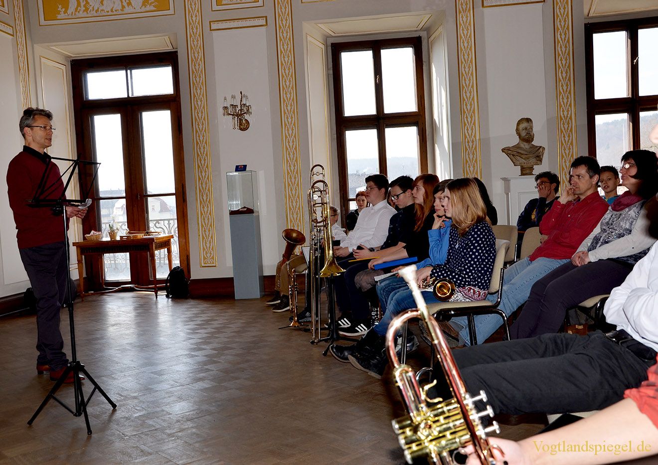 Musikschulpädagoge Matthias Härtig (l.) gab viel Wissenswertes zu den Blechblasinstrumenten preis.
