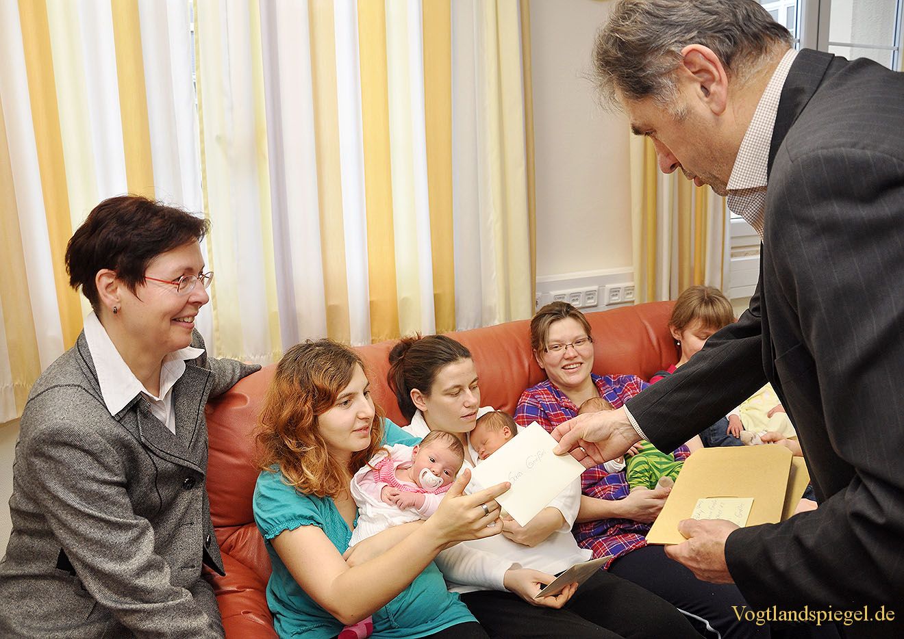 Thüringens Sozialministerin Heike Taubert (l.) und Gerd Grüner, Bürgermeister der Stadt Greiz begrüßten in der Wochenstation des Greizer Krankenhauses die ersten vier Babys des Jahres 2013. v.r. Pascal, Johannes, Lucy und Viktoria mit ihren Muttis.