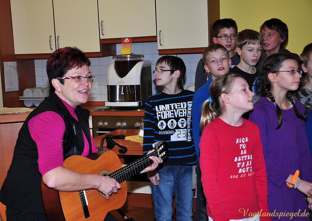 GREIZ. Seit langem gibt es zwischen der Lessing-Regelschule und dem CURANUM-Seniorenwohnzentrum „An der Schlossbrücke“ einen Kooperationsvertrag. Ihn kontinuierlich mit Leben zu erfüllen, haben die Schüler und Pädagogen dabei fest in den Fokus gerückt. Am Mittwochmittag hatte der Paul-Dessau-Chor unter Leitung von Doris Marek eine ganz besondere halbe Stunde vorbereitet. Die Aktion Mensch unterstützt unseren Chor bei einer Aktion, die Junge und Alte verbindet, umriss Frau Marek das Thema. Mit frisch gesungenen Liedern, Tänzen und musikalischen Beiträgen unterhielten die Regelschüler die Senioren, die sich bereits erwartungsfroh im Speisesaal eingefunden hatten. Mit Titeln wie Geburtstag hat man leider nur einmal im Jahr, Der Herbst, der ist ein Malersmann, Hallo, good morning oder Wir brauchen keinen Walkman, wir haben Livemusik unterhielten die jungen Sängerinnen und Sänger, von Doris Marek am Klavier oder der Gitarre begleitet, die betagten Damen und Herren. Ziel ist es vor allem, die Senioren in unser Programm einzubeziehen, ihnen auch ein Instrument in die Hand zu geben und Rhythmus zu vermitteln, so Doris Marek. So bekamen die Senioren von den Kindern Klanghölzer oder Triangeln überreicht, die sie zu den Liedern einsetzten. Dass es ihnen sichtlich Spaß machte, konnte man sehr gut erkennen. Die funktionierende Kooperation mit den Lessings lobte auch Ergotherapeutin Dominique Wolf, die sich bei den jungen Choristen für ihre Darbietung herzlich bedankte.