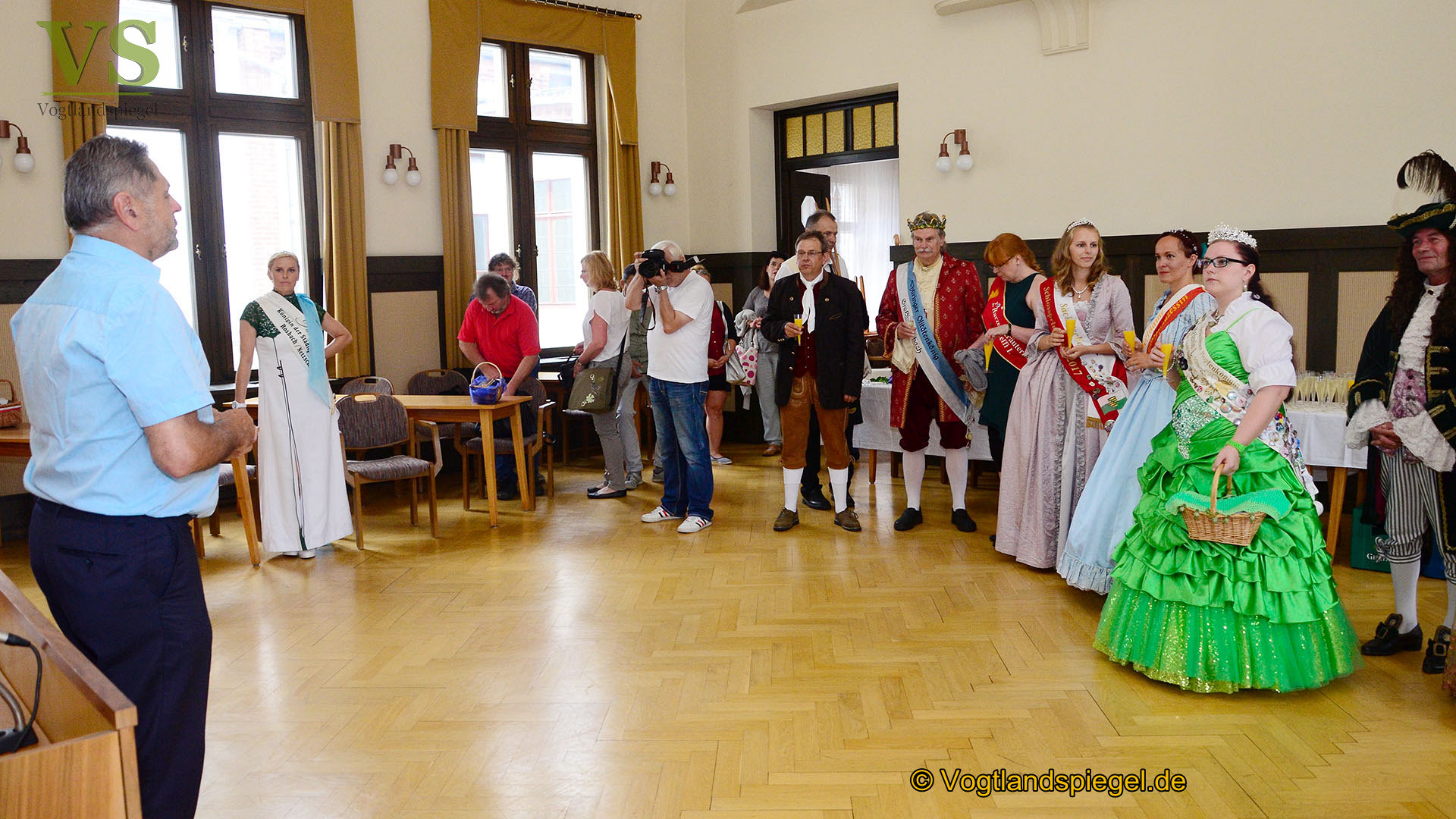 Bürgermeister Gerd Grüner (l.) begrüßt die Gäste im Rathaussaal.