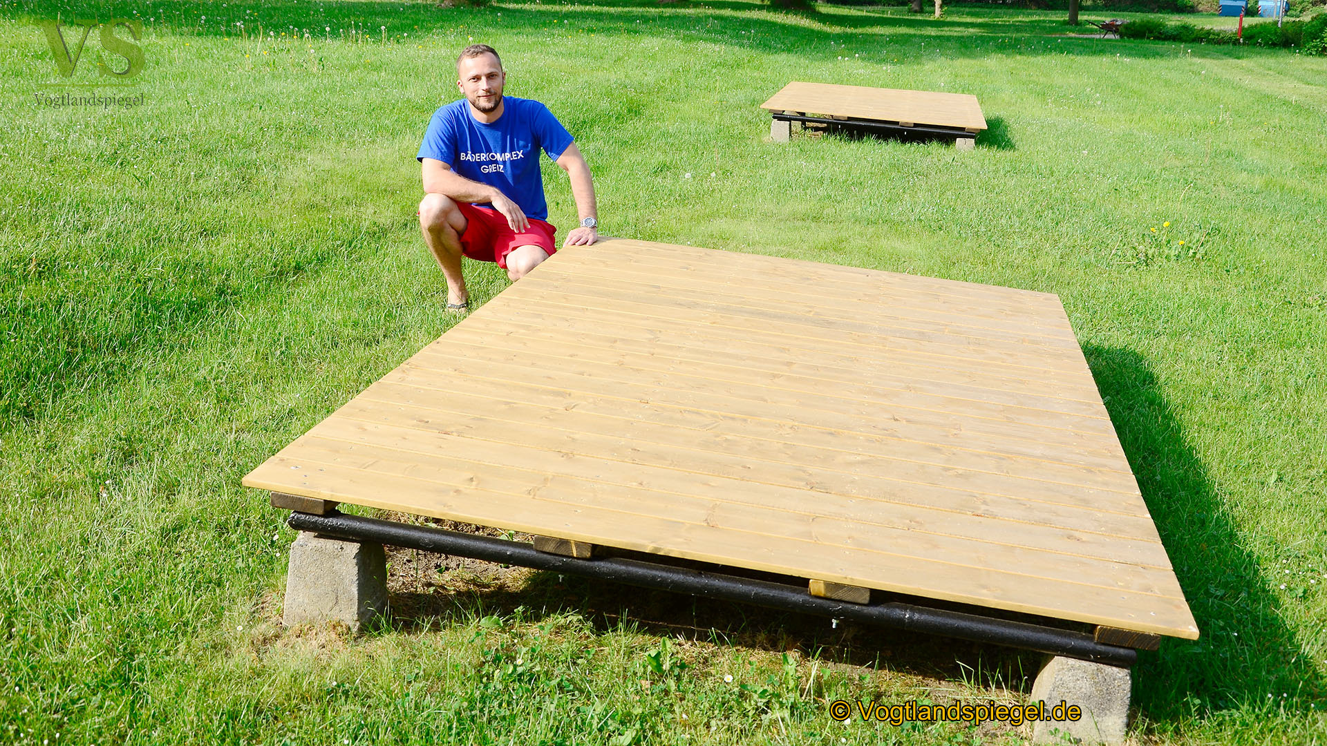 Der Leiter des Bäderkomplexes der Stadt Greiz, Jan Fleischer, vor einer der neu aufbereiteten Holzliegen.