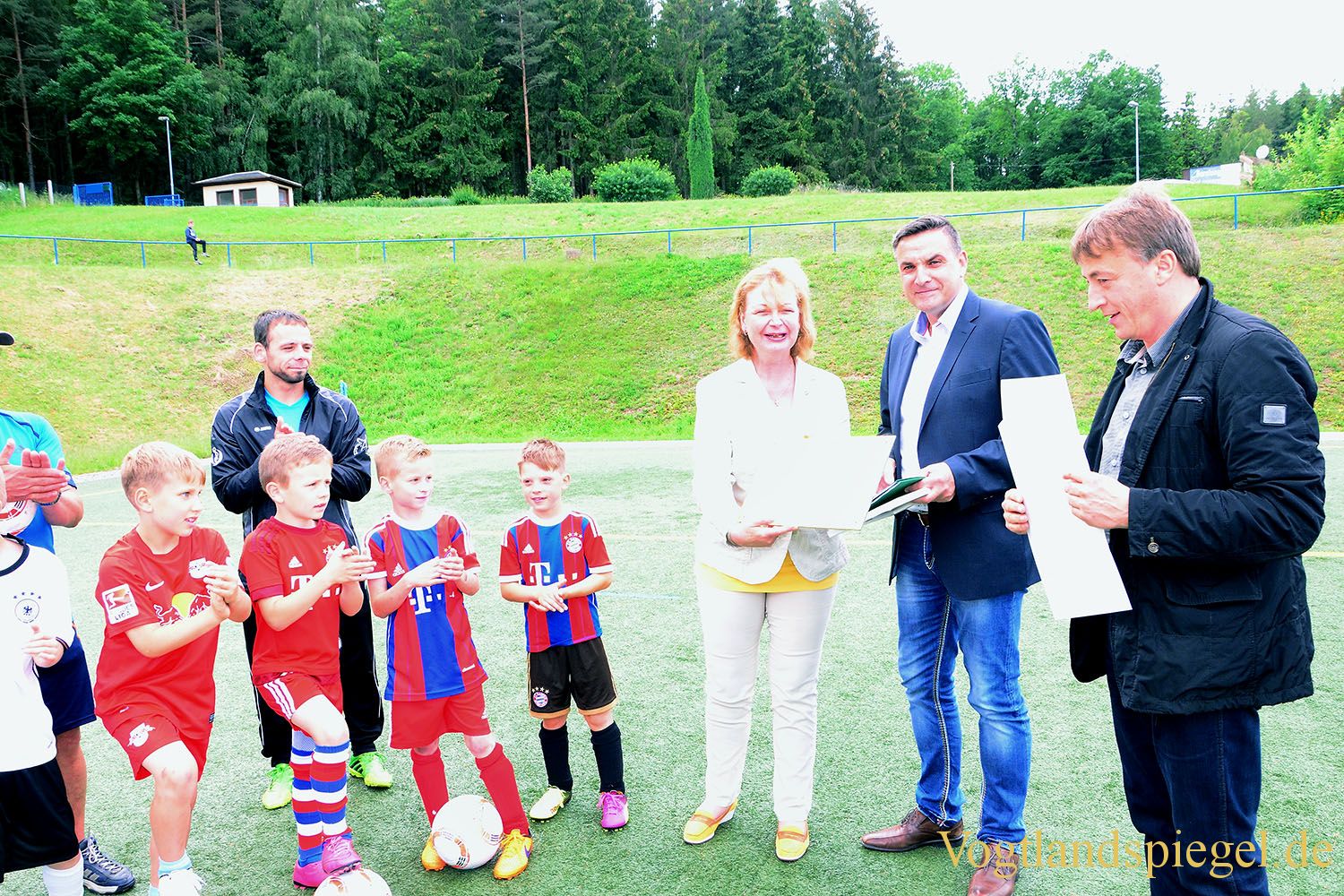 Landrätin Martina Schweinsburg (CDU) überreicht dem Präsidenten des 1. FC Greiz, Frank Brettfeld (2.v.r.) die Anerkennungsurkunde zum Talentförderzentrum und einen Fördermittelbescheid.Rechts im Bild Uwe Jahn.