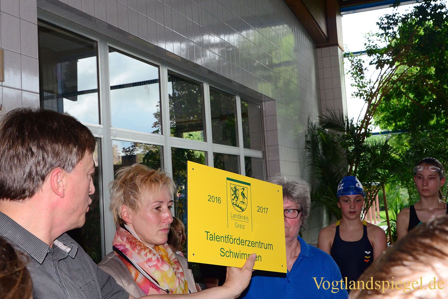 Für die nächsten zwei Jahren ist der 1. Schwimmklub Greiz anerkanntes Talentförderzentrum. Uwe Jahn zeigt die Plakette.
