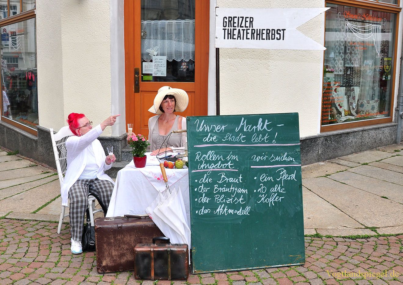 Auf dem Greizer Markt hat Regisseurin Julia Amme (r) ihren kleinen, feinen Stand aufgebaut.