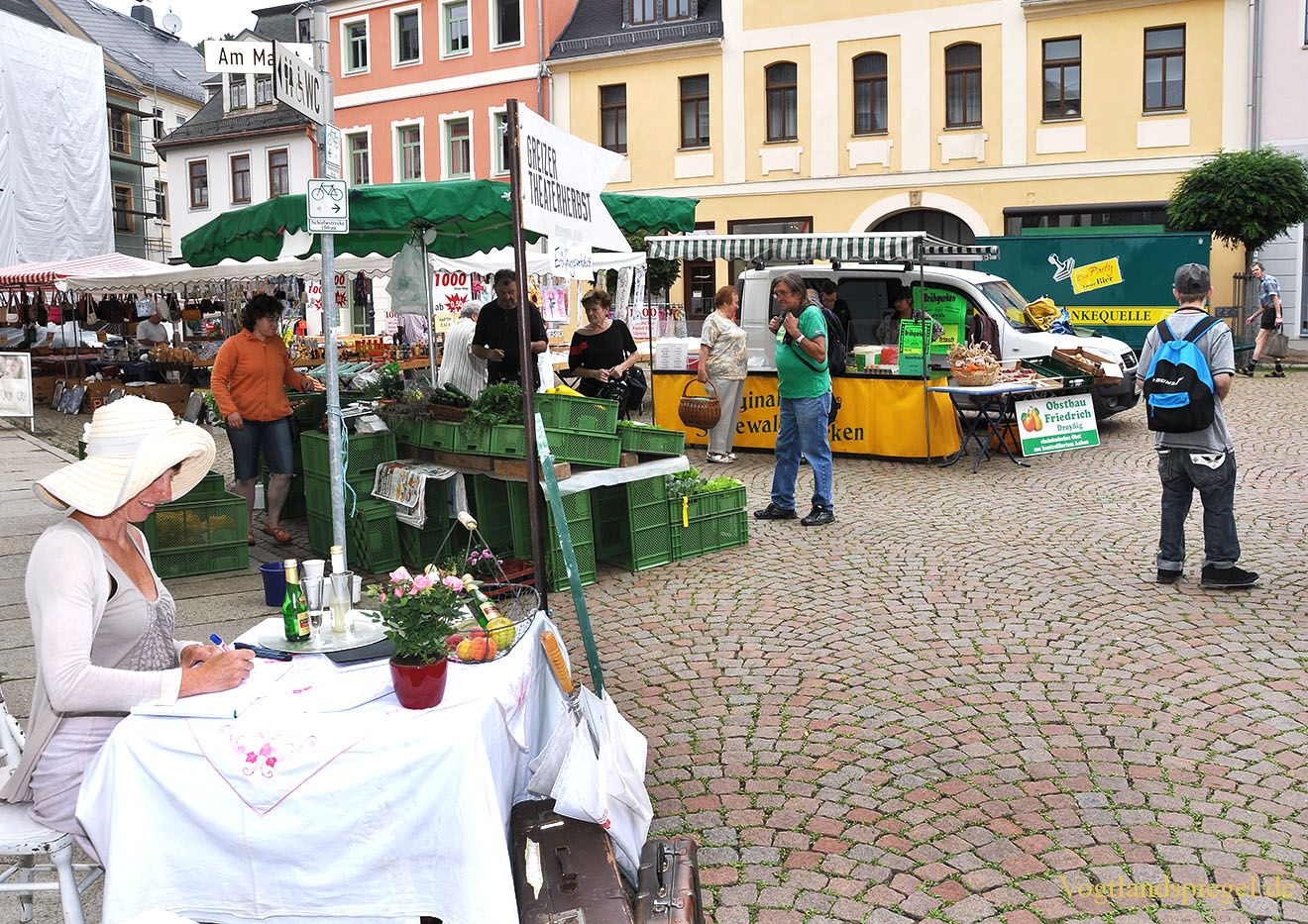 Buntes Markttreiben auf dem Greizer Markt, links der Stand von Julia Amme.