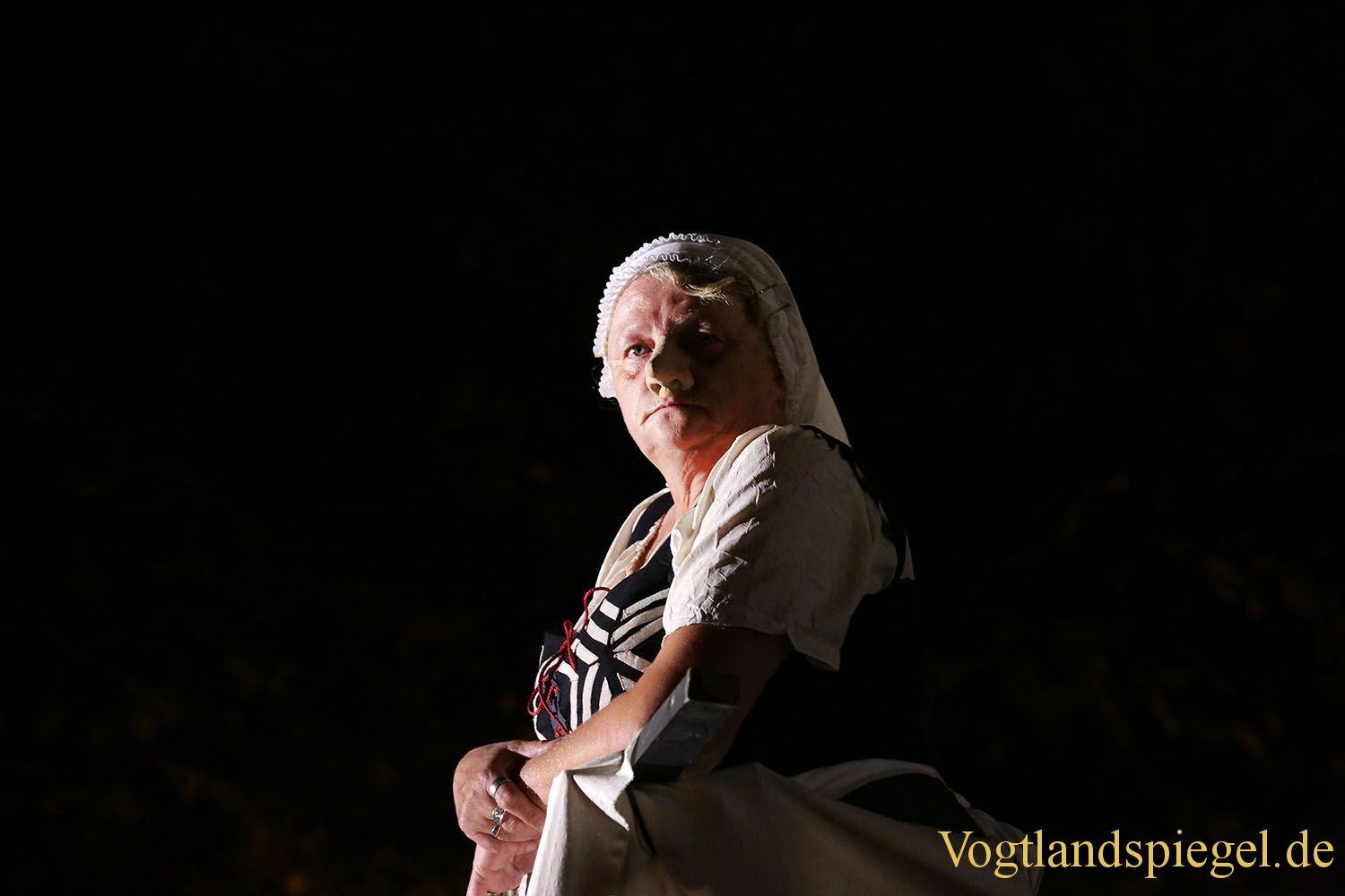 Szene aus der Eröffnungsinszenierung des 25. Greizer Theaterherbstes „Der Teufel mit den Titten“ auf dem Greizer Kirchplatz – hier Sabine Petri.