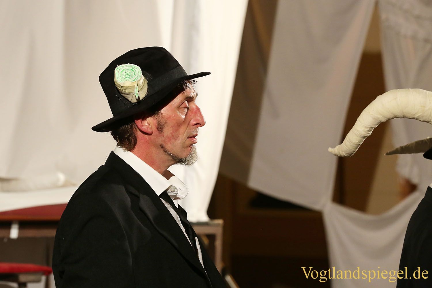 Szene aus der Eröffnungsinszenierung des Greizer Theaterherbstes „Der Teufel mit den Titten“ – auf dem Greizer Kirchplatz. Hier Teufel Martin Opitz.