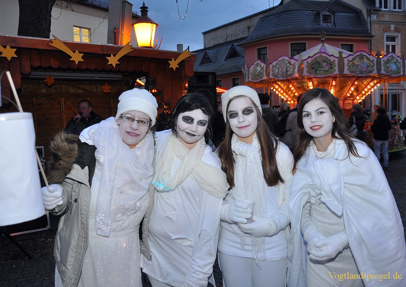 Die Weißgeister des Greizer Theaterherbstes sind auf dem Weihnachtsmarkt unterwegs.