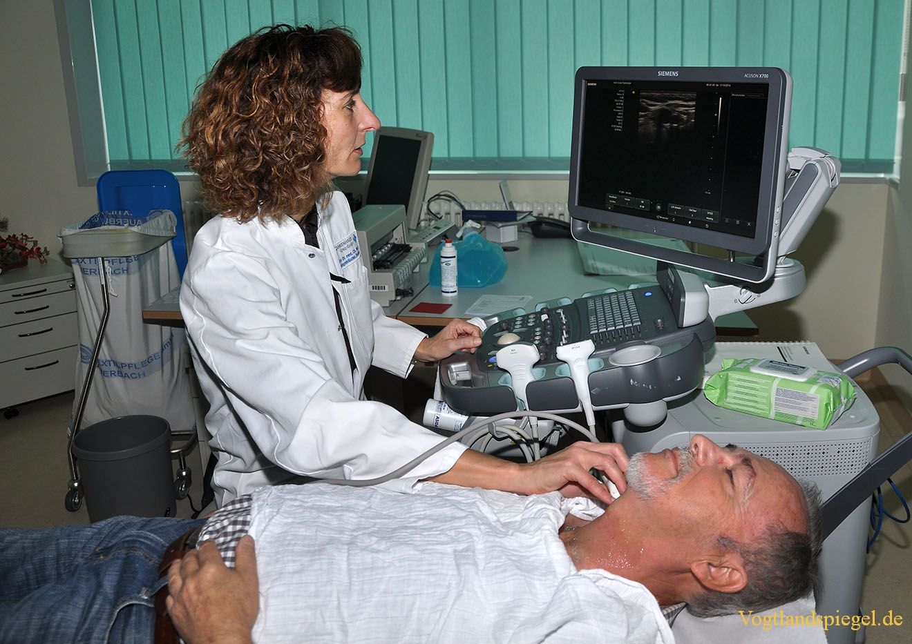 Die Chefärztin der Röntgendiagnostischen Abteilung, Dr. med. Christiane Marx führt bei einem Patienten ein Halsschlagader-Screening aus.