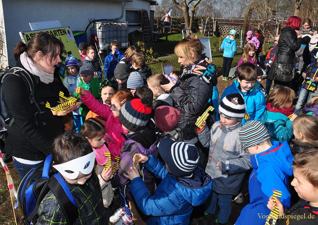 Die Kinder der Zaschberg-Grundschule nehmen ihre selbstgefertigten Brillen im Empfang.
