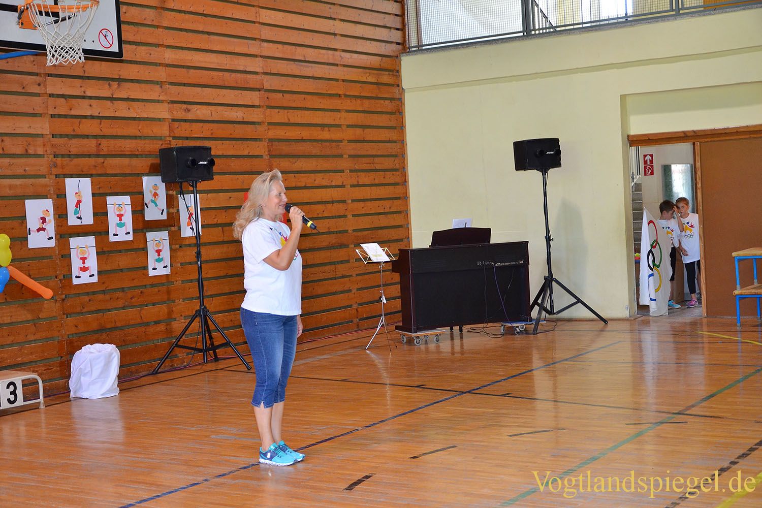 Schulleiterin Antje Schwarzkopf begrüßt die Mannschaften in der Turnhalle der Grundschule Greiz-Pohlitz.