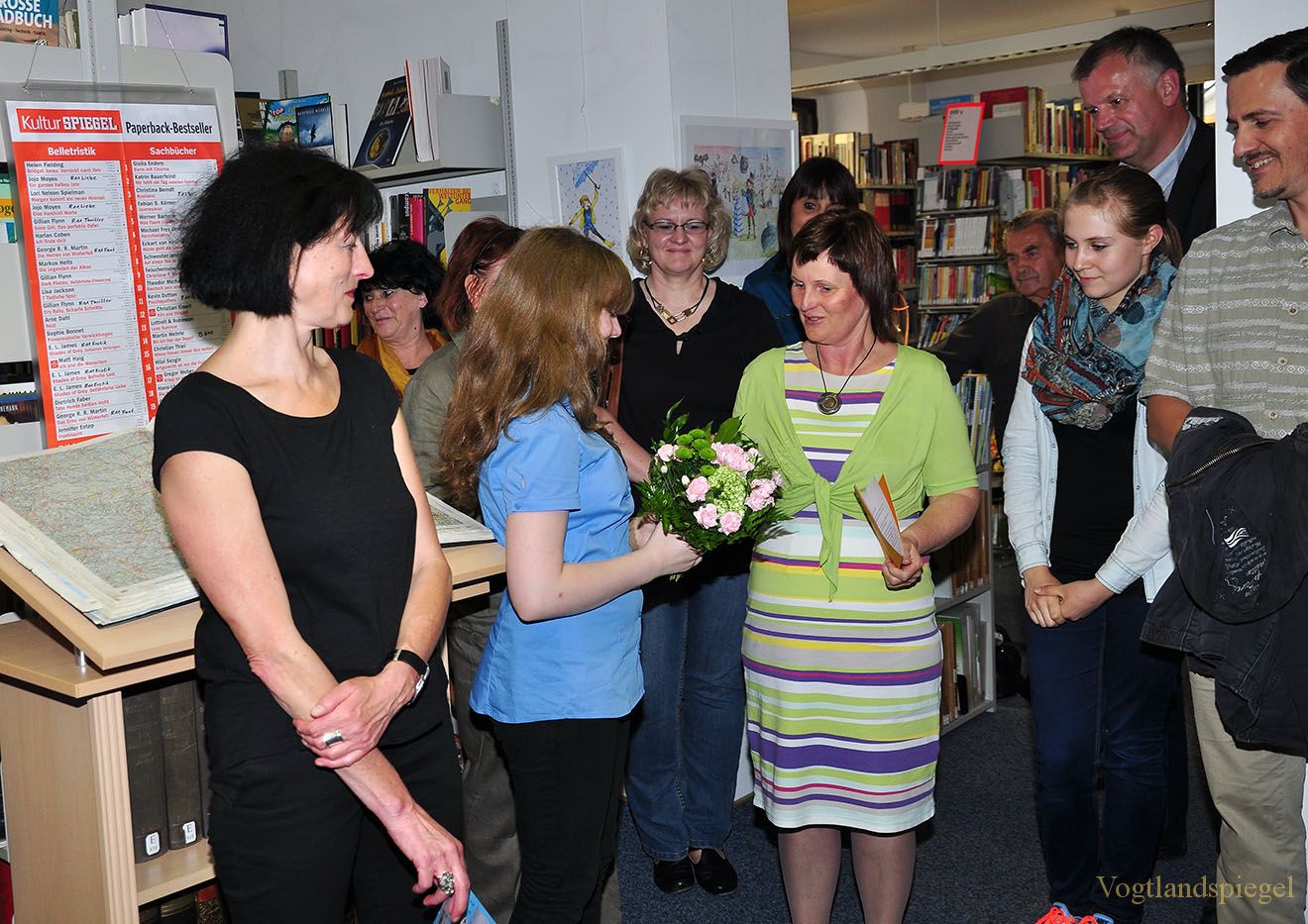 Pädagogin Heike Seifert (r.) übergibt Selina Kusche zur Vernissage einen Blumenstrauß.