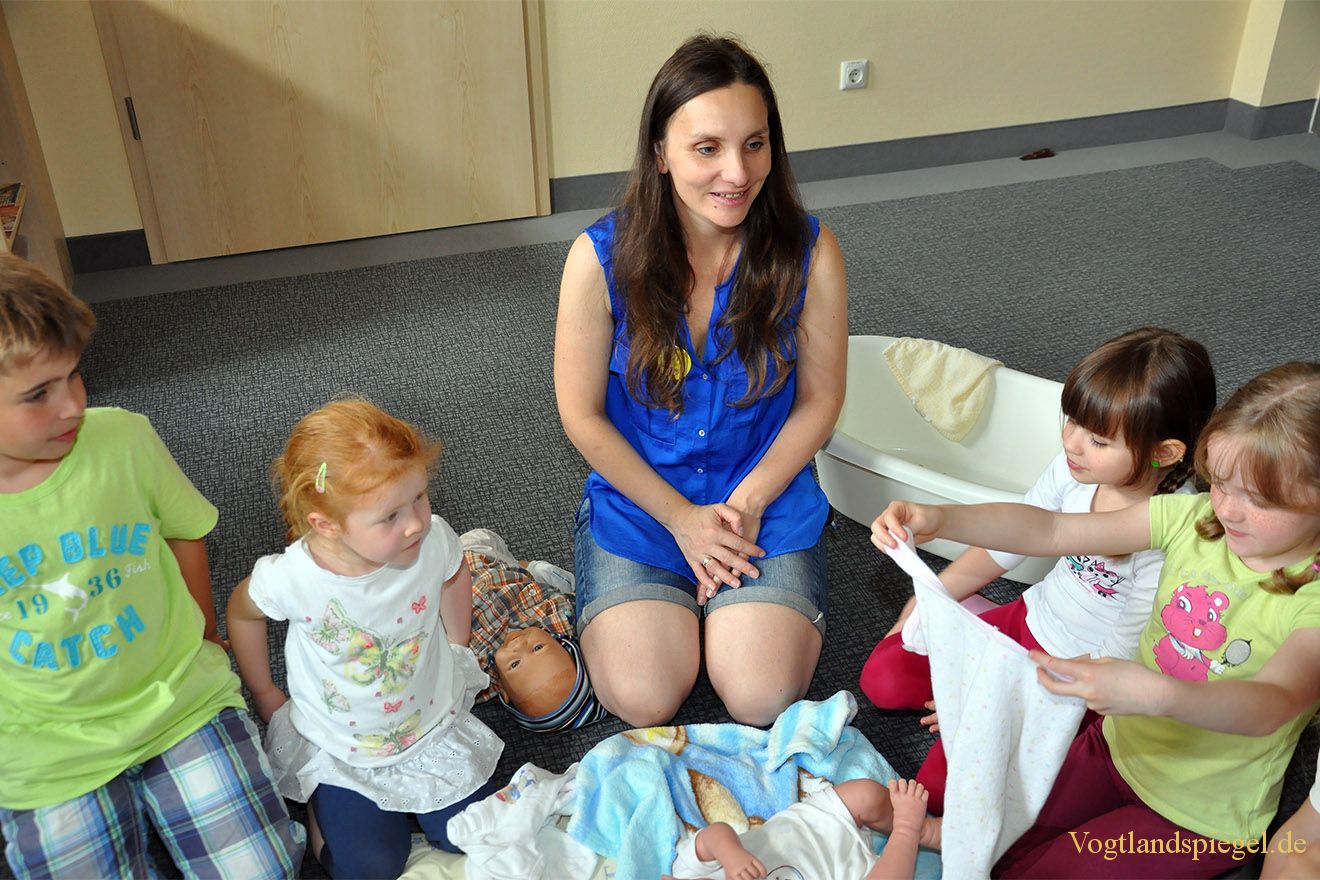 Mit großem Eifer sind die Geschwisterkinder dabei, die „Babys“ anzuziehen.