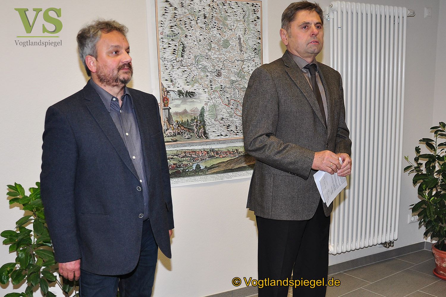 Bürgermeister Gerd Grüner (r.) und Vereinsvorsitzender Ulrich Jugel eröffnen die Ausstellung „Raizefibr ins Nachbarland“ im Haus 6 des Oberen Schlosses Greiz.