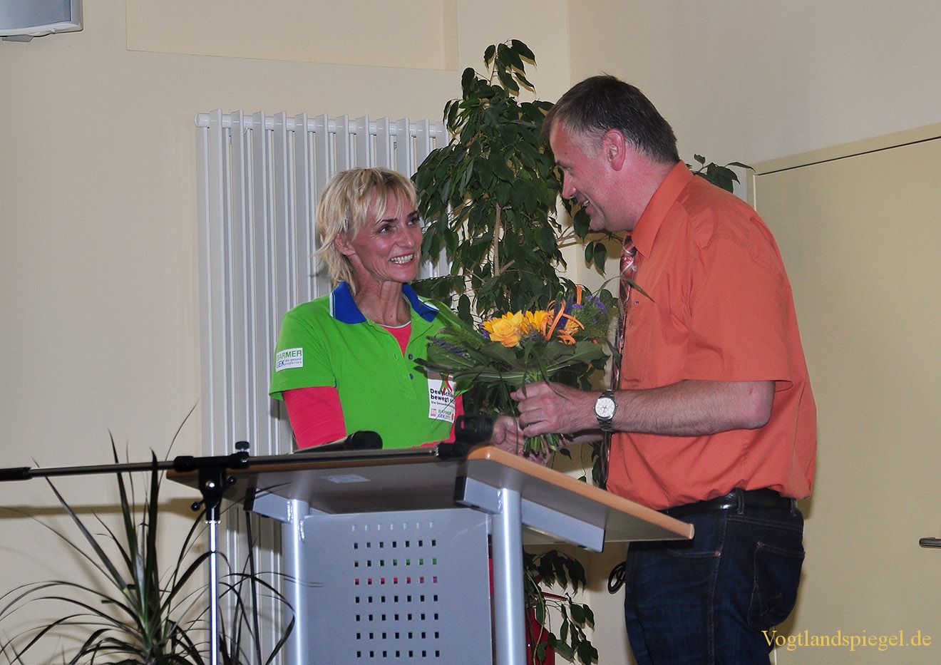 Schulleiter Jens Dietzsch bedankt sich bei Heike Drechsler mit einem Blumenstrauß.