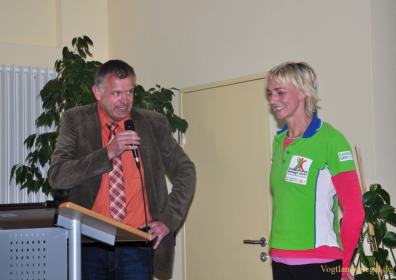 Schulleiter Jens Dietzsch begrüßt die Sportlerin Heike Drechsler herzlich.