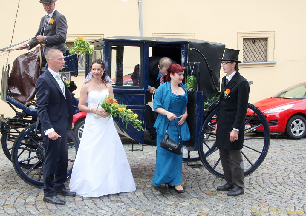 Doreen und Christian Weiß bekamen von Reit-und Fahrverein Mohlsdorf eine echte Überraschung geschenkt.GREIZ. Auf dem Rücken der Pferde liegt ( für manchen ) das Glück dieser Erde, so ist es wohl für Doreen ( geborene Kreim ) und Christian Weiß auch, die am vergangenen Sonnabend den Bund für’s Leben in der Alten Wache in Greiz schlossen. Beide, seit vielen Jahren Mitglied im RFV Mohlsdorf e.V. – er begeisterter Kosakenreiter, sie hat sich dem Dressurreiten verschrieben – wurden standesgemäß im großen Landauer mit fünf vorgespannten Pferden, die vom Vereinsvorsitzenden Hubert Jäschke geführt wurden, chauffiert, während die Eltern von Braut und Bräutigam in zweispännigen Kutschen das Brautpaar begleiteten. Aufsehen hat diese Kavalkade der Kutschen und Reiter auf seinem Weg von Mohlsdorf nach Greiz schon erregt, ließen es sich doch die Reiterinnen und Reiter des RFV Mohlsdorf e.V. nicht nehmen hoch zu Ross, im Sattel und auf dem Kutschbock ihre Sportkameraden an ihrem schönsten Tag zu begleiten und ihnen eine gute Zeit für den neuen Lebensabschnitt zu wünschen. Peter Reichardt @02.07.2013