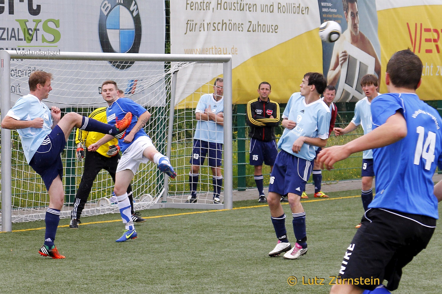 Auf dem Greizer Tempelwaldstadion fand der Industrieforum-Cup statt. Szene aus dem ersten Halbfinale Scheler gegen Volksbank