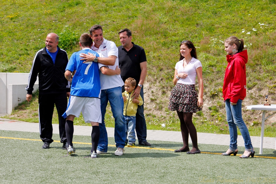 Natürlich gab es auch Einzelauszeichnungen. Dabei wurde aus den Reihen der Spieler die Frage in den Raum gestellt, ob denn auch der schönste Spieler ausgezeichnet werde. Siehe da, bei der Siegerehrung und der Pokalübergabe hatte der Veranstalter, an dessen Spitze Jens Geißler, zwar die schönsten Damen mit auf den Platz gebracht, doch die Kicker trauten sich nicht, den schönsten Kicker zu bestimmen. ältester Spieler des Turniers war Mario Mohr, der sonst in den Reihen der Alten Herren der SG Greiz aufläuft und in diesem Turnier für das Team Koehler spielte. Zum besten Spieler erklärten Mannschaftsleiter und Betreuer Andy Neiß, der im Team Spaleck spielte. Die Trophäe des besten Torwarts konnte Philipp Wünsch, der für das Team BMW/Zurich zwischen den Pfosten stand, entgegen nehmen. Und Alexander Hamann mit sechs Treffern für die Volksbank konnte sich die Torschützenkrone aufsetzen.