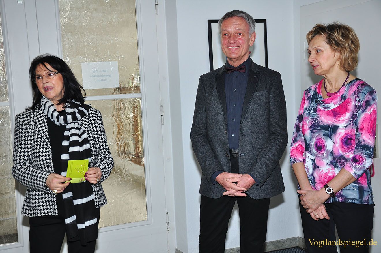Die Plauener Künstlerin Ingrid Trautlofft (l.) spricht einige Worte zu ihren Werken.