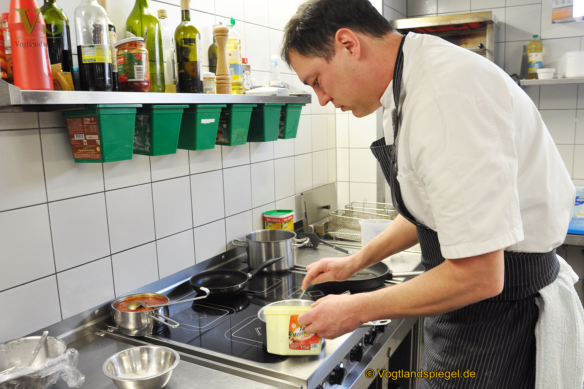 Zum Probeeseen waren auch in diesem Jahr Medienvertreter in die Gaststätte Reihe 1 eingeladen worden. Nun wird dem Fonds von Küchenchef Enrico Hesse Speisestärke zugefügt.