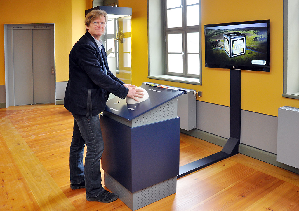 Museumsdirektor Rainer Koch beim Vorstellen der neuen interaktiven Spielstation im Obergeschoss des Oberen Schlosses Greiz.