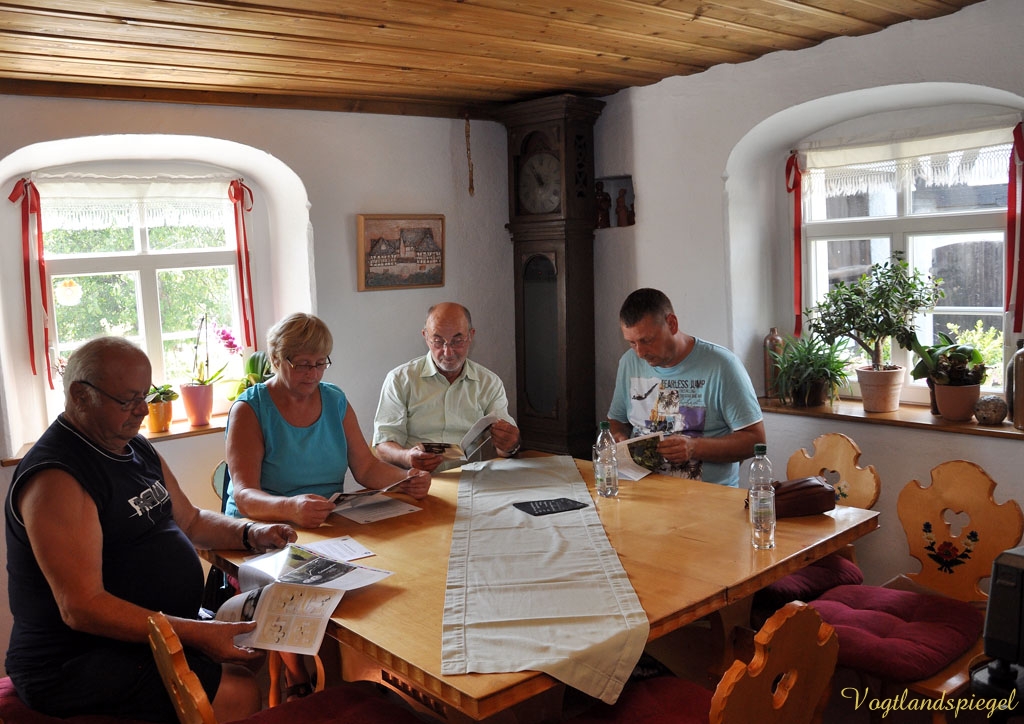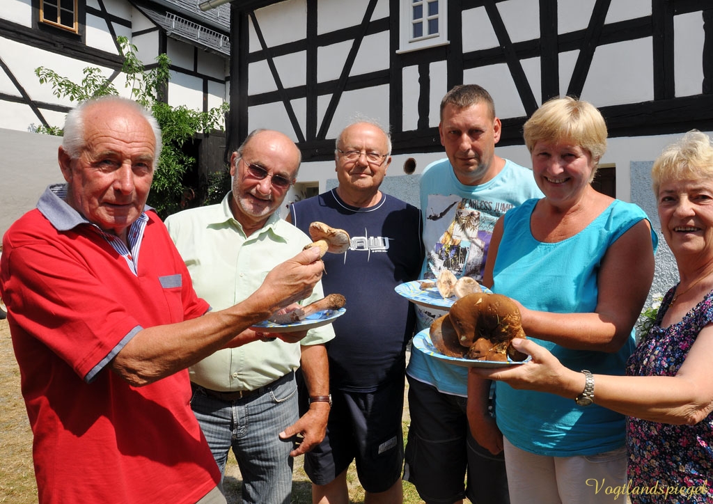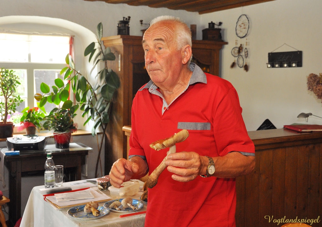 Christoph Hempel hielt im Bauernmuseum Nitschareuth einen Vortrag über Pilze in unserer Region. Hier der Pilzexperte (l.) gemeinsam mit Ehefrau Rosmarie (r.) und Interessierten im Hof von NitschreuthNITSCHAREUTH. Wer gern Pilze isst, sollte sich auskennen. Das unterstrich einmal mehr Pilzsachverständiger Christoph Hempel, der am Sonnabendnachmittag im Bauernmuseum eine Reihe von Interessierten mit diesem Thema kompetent vertraut machte. Der Langenwetzendorfer ist seit fast dreißig Jahren Pilzberater, interessierte sich schon als Jugendlicher für die Mykologie. Die Leute können mit ihren gesammelten Pilzen zu mir kommen und ich berate sie natürlich kostenlos, wie Christoph Hempel betont. Damit man immer auf dem neuesten wissenschaftlichen Stand ist, müssen die Fachleute aller vier Jahre zu einer Fortbildung und sich auch einer fachkundigen Prüfung unterziehen. An seine Prüfung zum Pilzberater im Jahr 1984 kann sich der heute 74-Jährige noch gut erinnern: Vor mir wurde Pilzquartett ausgebreitet, in dem alle Beschreibungen überklebt waren, Ich musste alle Pilze bestimmen und wichtige Kriterien dazu angeben. Wie Christoph Hempel erläutert, gibt es in unseren Gefilden, also dem Gebiet um Greiz, Zeulenroda und Berga etwa 70 bis 80 Arten von Speisepilzen, denen 183 Arten europäischer Giftpilze gegenüberstehen. Er rät, bei geringstem Zweifel, beim Sammeln lieber die Hände davon zu lassen oder eben den Experten aufzusuchen. Schon oft habe er aus den Körben der Sammler ungenießbare oder sogar giftige Exemplare aussortiert, wie Hempel vorgibt. So würden etwa die Gallenröhrlinge den Steinpilzen täuschend echt gleichen. Auch vor Giftchampignons, die nach Karbol riechen, warnt der Experte: Durch einen ganz einfachen Test kann ich das erkennen. Bei Berührung läuft der Pilz chromgelb an. Auch eine verängstigte Mutter, deren Kleinkind rohe Pilze auf der Wiese kostete, kam schon zu ihm. Ich konnte Entwarnung geben, so Herr Hempel, der die Wichtigkeit unterstrich, dass Pilze zur Bestimmung immer vollständig vorliegen müssen. Auch wies er darauf hin, niemals Plastetüten, sondern immer luftdurchlässige Behältnisse zum Sammeln zu benutzen. Wie aber sah die Pilzsaison bisher aus? Im Frühjahr recht gut, sagte Christoph Hempel, der von seiner Ehefrau Rosmarie assistiert wird. Der Mairitterling ist ein sehr guter Speisepilz. Anfang Juli sei eine Pilzschwemme erwartet worden, die aber nicht eintraf. Wenn es nach dem warmen Wetter der letzten Tage einen richtigen Regen gibt, können wir voller Erwartung sein, freut sich Christoph Hempel. Vor allem Perlpilze und Steinpilze würden dann recht schnell wachsen. Antje-Gesine Marsch @27.07.2013 Der Pilzexperte berät seit dreißig Jahren. Mit einem Diavortrag gab Pilzexperte Christoph Hempel wichtige Informationen zum Umgang mit Pilzen. Trotz brütender Hitze kamen einige Interessierte ins Bauernmuseum Nitschareuth Gemeinsam mit Frau Rosmarie war er ins Bauernmuseum Nitschareuth gekommen.