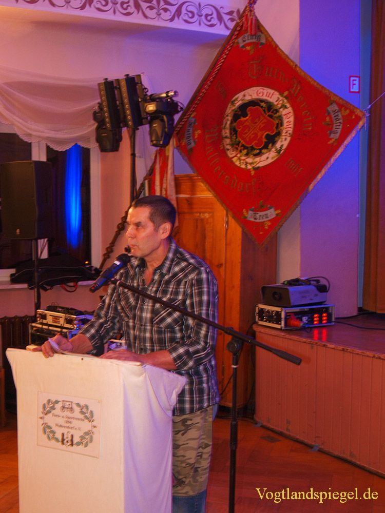 Der Vereinsvorsitzende des TSV 1890 Waltersdorf e.V., Ralf Restis, trägt den Rechenschaftsbericht der Mitgliederversammlung 2016 vor. Hinten die Traditionsfahne des Vereins von 1910.