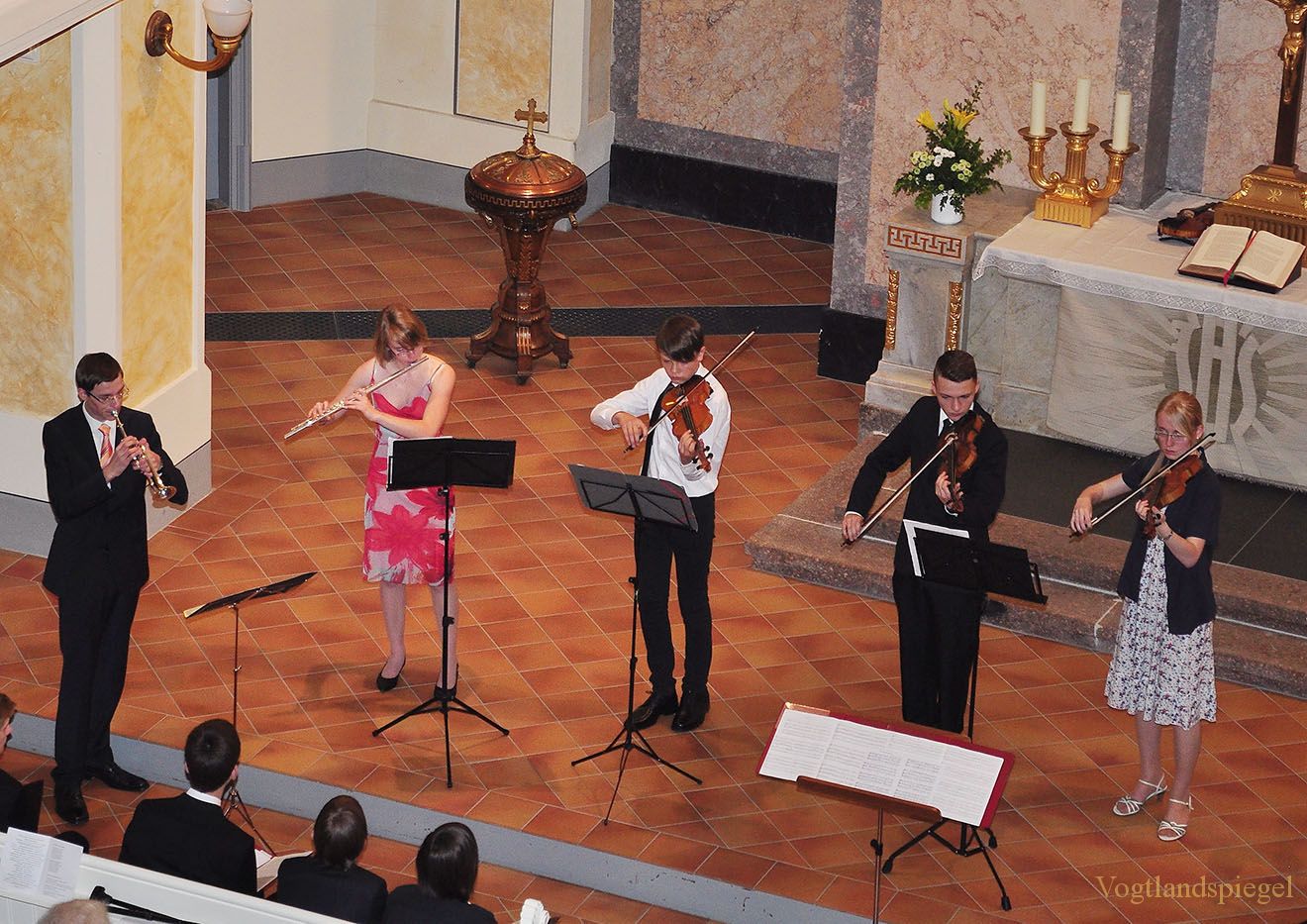 Das Instrumental-Ensemble des Jugendchores musiziert mit Stavenhagenpreisträger Michael Merkel (l.).