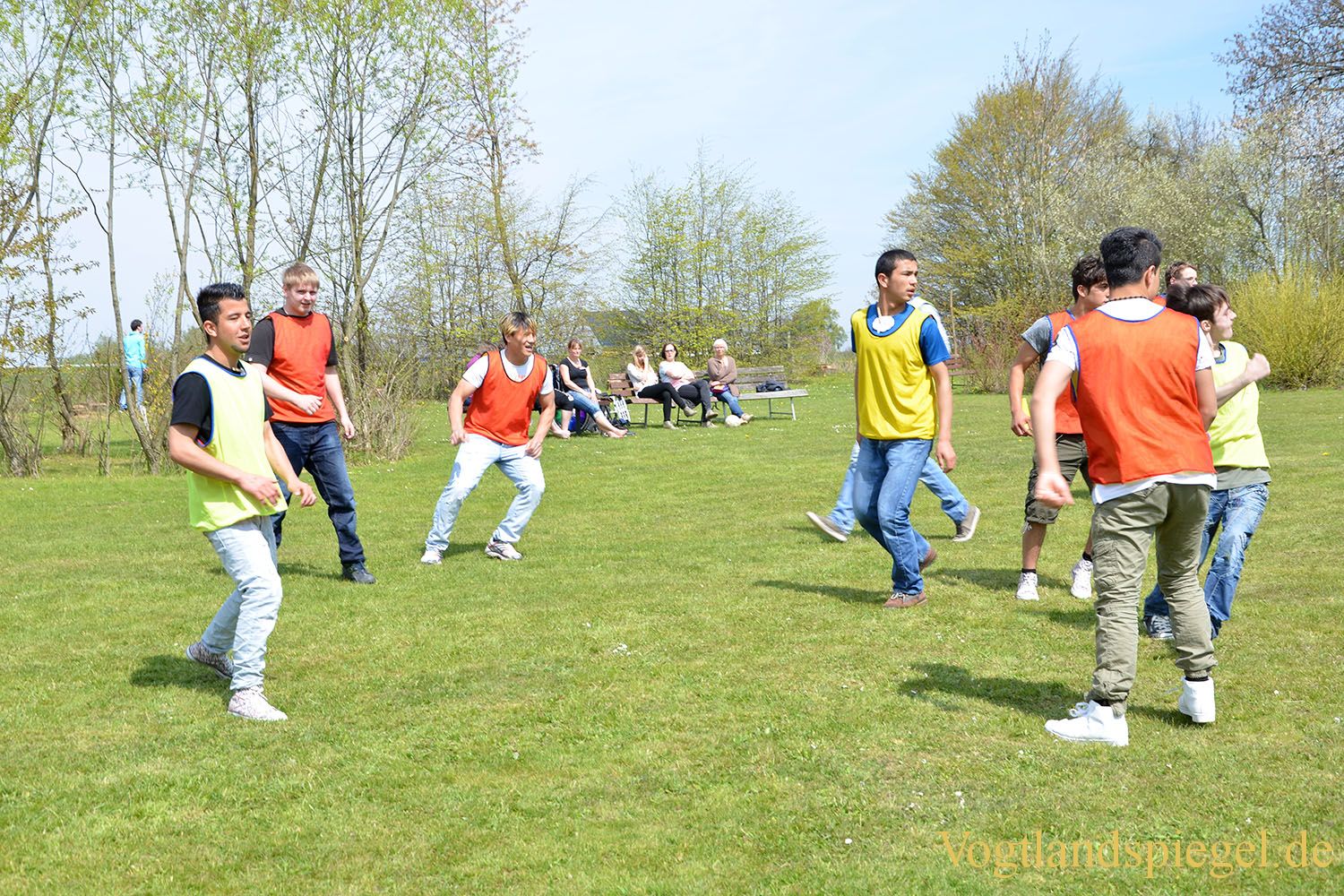 Szene aus dem Fußballspiel der Unbegleiteten Minderjährigen Asylbewerber gegen Schüler der Carolinenschule.