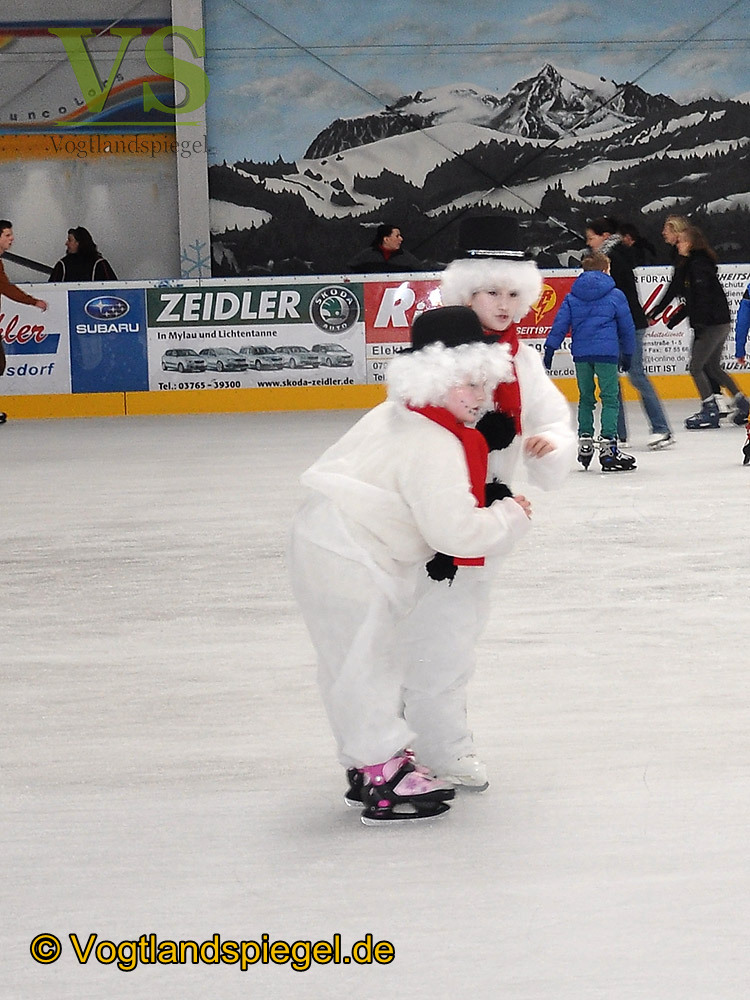 Zwei Schneemänner gehörten auch zu den Gästen des Kindereisfaschings auf der Eissportfläche Greiz.