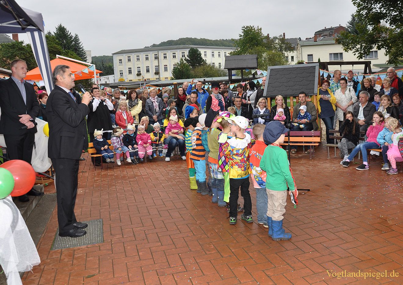 Bürgermeister Gerd Grüner (l.) begrüßt die Gäste des Festes in der Kita „Käte Duncker“.
