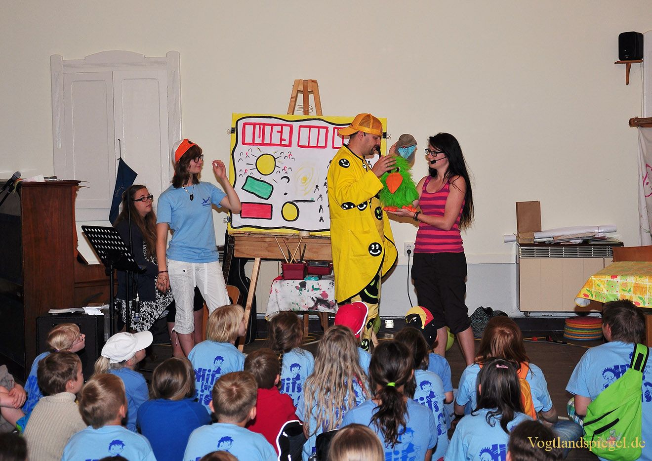 Ruth (r.), Vogel „Emil“ und Daniel gestalten zur Kinderferienwoche das morgendliche Programm.