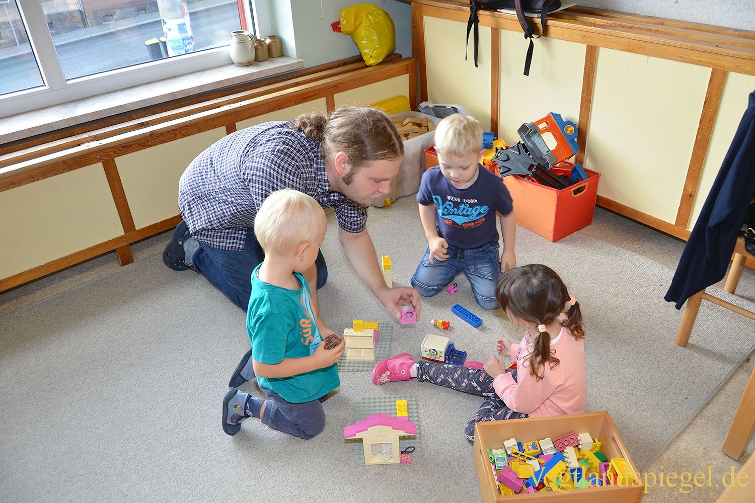 Erzieher Sebastian Willer spielt mit den Kindern.