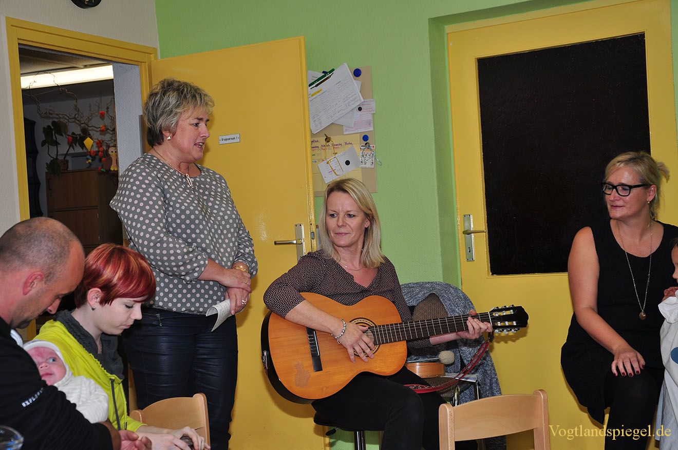 Die Leiterin der Kita „Juri Gagarin“, Ulrike Werner (l.) begrüßt die Gäste.