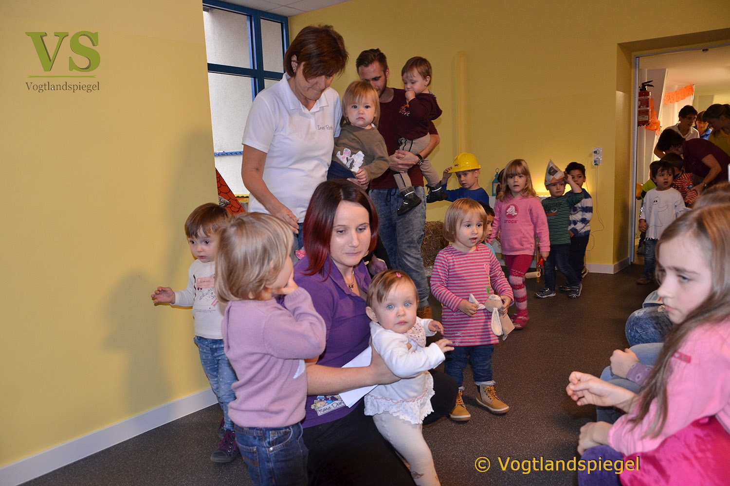 Die Großen und Kleinen des Käte-Duncker-Kindergartens kommen herein.