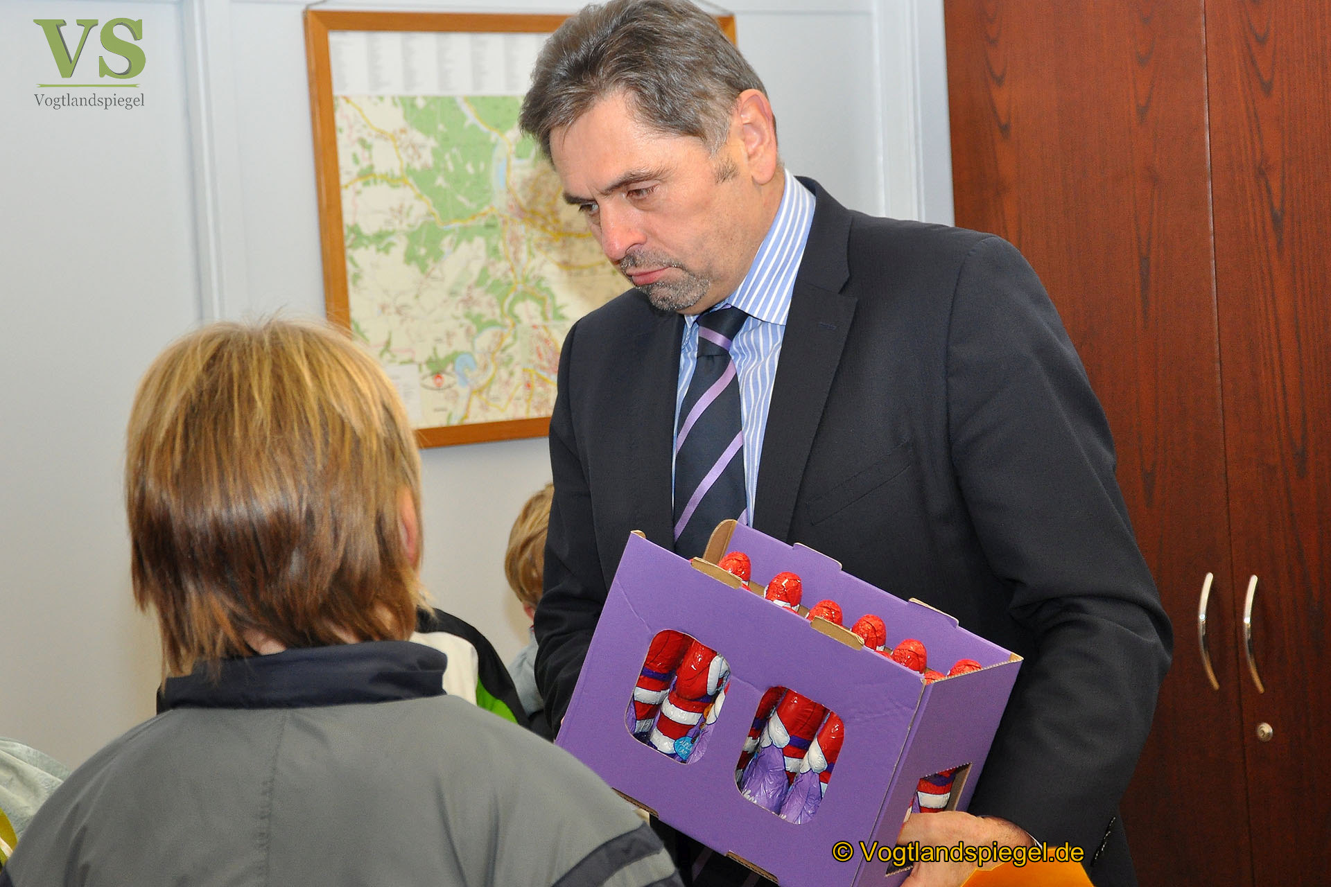 Gerd Grüner übergibt den Kindern einige Naschereien