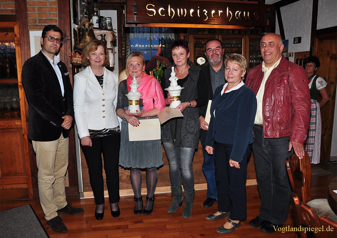 In der Zeit von Mai bis August wurden durch die Jury unangemeldet dreizehn Gaststätten aufgesucht. „Eine enorme Herausforderung“, wie Pedra Hofmeister lächelnd zugab. Dabei gehörten zu den Bewertungskriterien das Angebot an traditionellen und einheimischen Getränken und Speisen, die Zubereitung und der Geschmack, die Verwendung von frischen regionalen Produkten, das originelle und typische Ambiente, die Gastfreundlichkeit und kompetente Bedienung sowie die Sauberkeit und Hygiene. Am besten wurde dies nach Meinung der fachkompetenten Jury bei zwei Gaststätten umgesetzt: im Restaurant „Zellreder“, Zeulenroda sowie dem Gasthaus „Thüringer Hof“ in Auma-Weidtal. Aus den Händen von Landrätin Martina Schweinsburg nahmen Petra Rocktäschel-Darger und Kerstin Friedrich als neue „Kloßvögtinnen“ den Wanderpokal entgegen. Kay Stockmann, der Vorjahressieger, musste diesen zwar schweren Herzens abgeben, bekam aber einen Keramikteller überreicht, den er gut sichtbar im Gasthof platzieren kann. „Nur gute Erfahrungen“ kann der Chef des „Schweizerhauses“ durch den Kloßvogt-Sieg mitteilen, vor allem, dass auch Gäste der Umgebung gezielt in sein Gasthaus kamen.