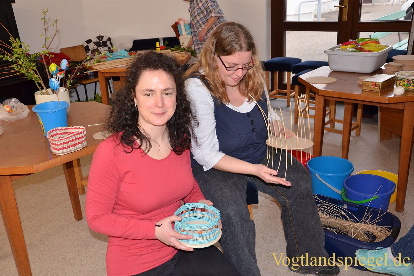 Kerstin Czwienczek (l.) zeigt ein selbst geflochtenes Osterkörbchen.