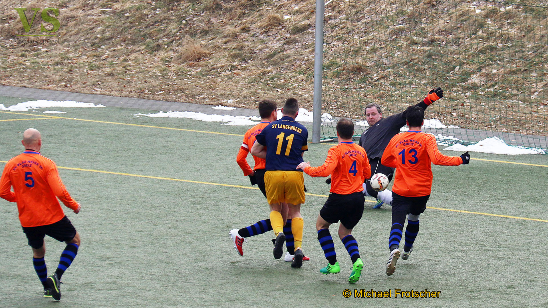 Glanzparade durch Rene Dressler,den Keeper der Blau-Weißen,nachdem ein Langenberger Spieler im Strafraum frei zum Schuss kam,bevor die Abwehr zur Stelle war.