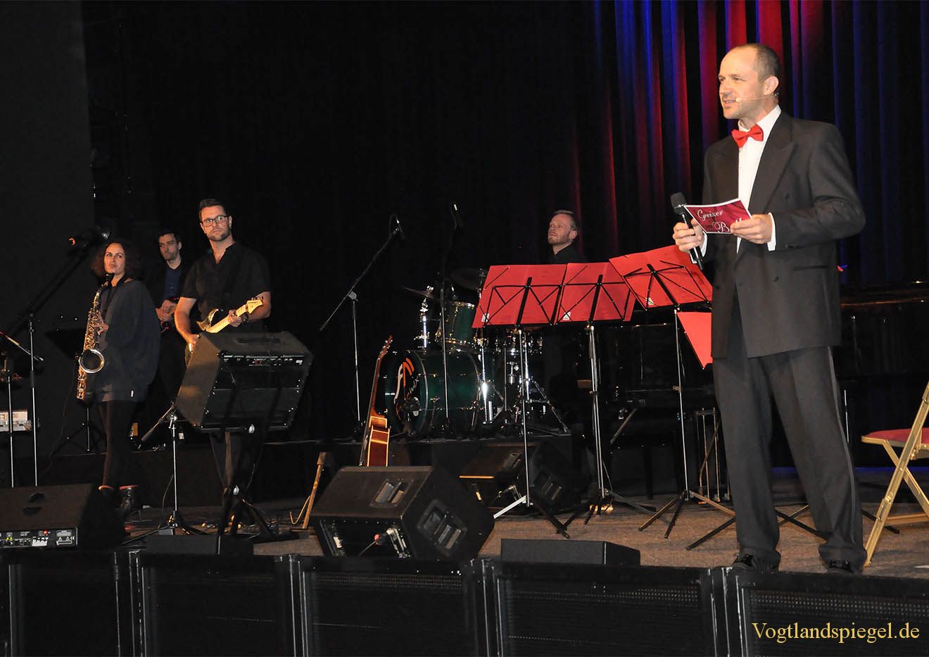 Musikschulleiter Ingo Hufenbach begrüßt die Gäste des Greizer Balls in der Vogtlandhalle Greiz.