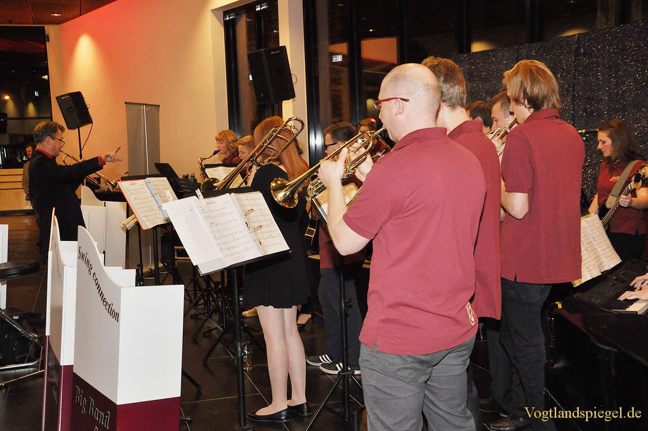 Die BigBand „Swing Connection“ unterhält im Foyer der Vogtlandhalle Greiz mit flotten Rhythmen.