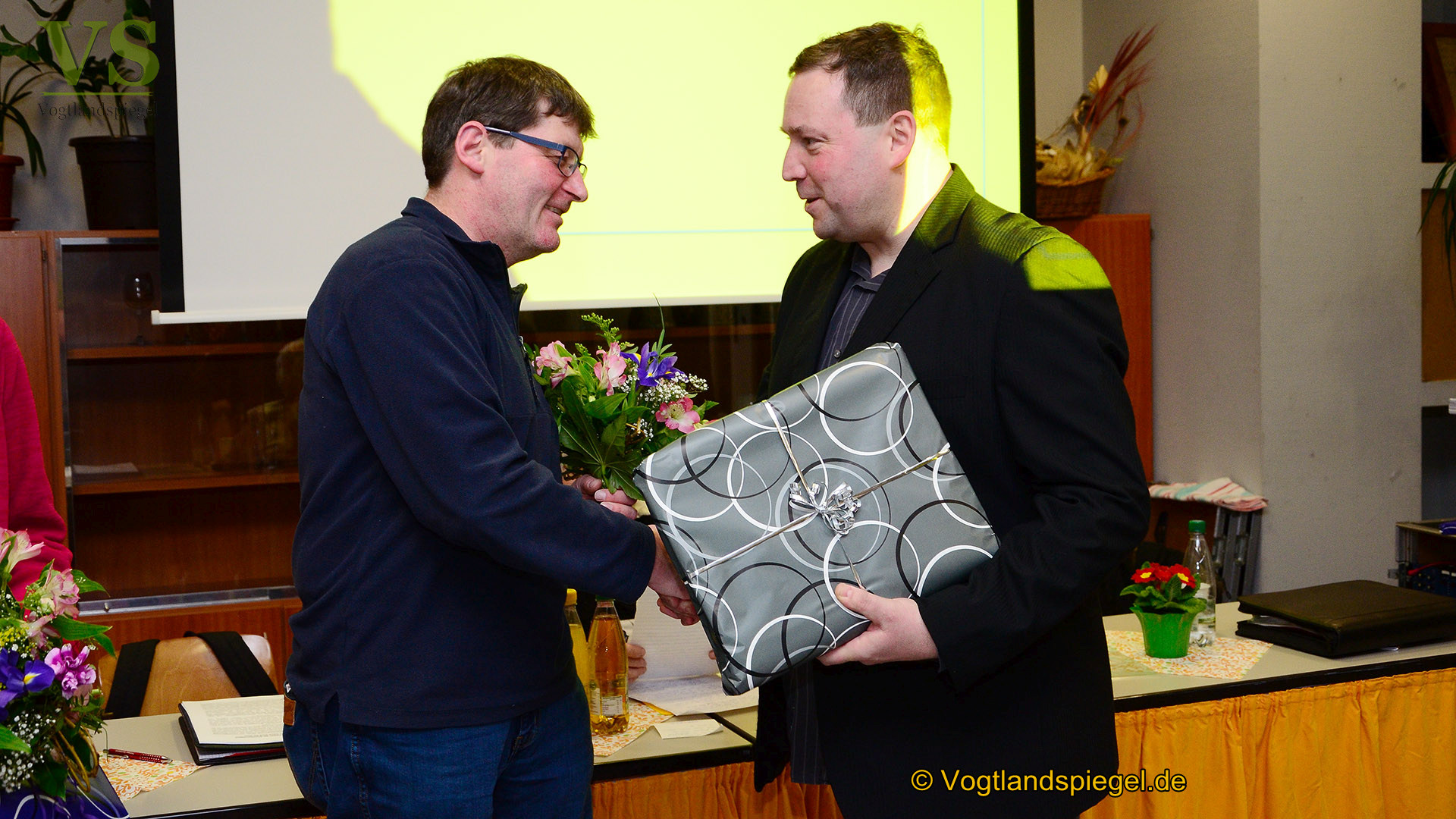 Jan Koschinsky (r.) überreicht Olaf Beer vom SV Großenstein eine Auszeichnung.