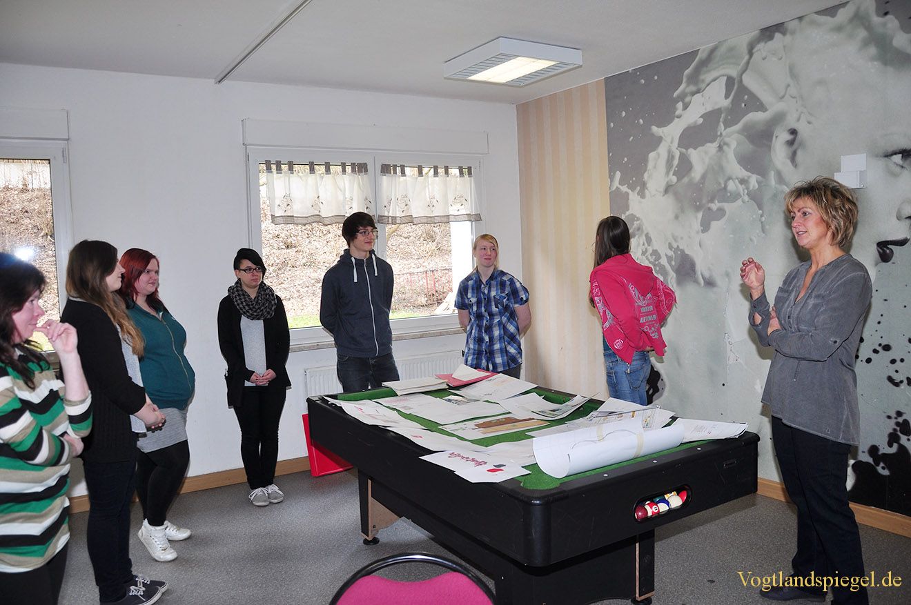 Die Fachlehrerin für Raumgestaltung an der „Ernst-Arnold-Schule“, Constanze Kick (r.) gibt Erläuterungen zum Projekt.